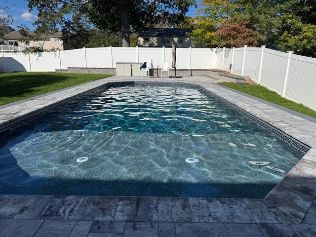 This pool in Toms River, NJ was sunken into the ground and completed with our landscaping package!